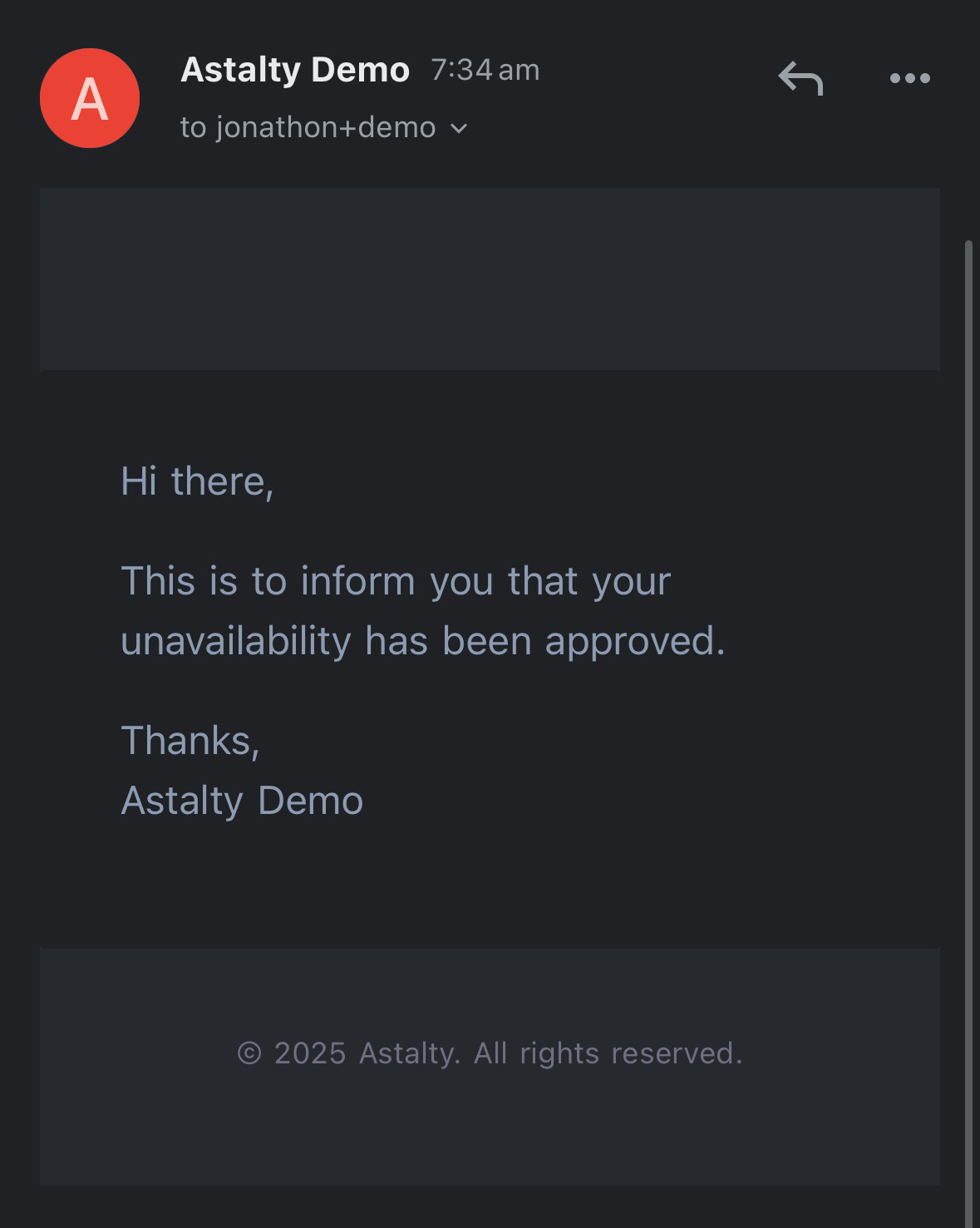 Once leave is approved, users will receive a notification in the app as well as an email confirmation. This ensures users are always up to date on the status of leave requests.
