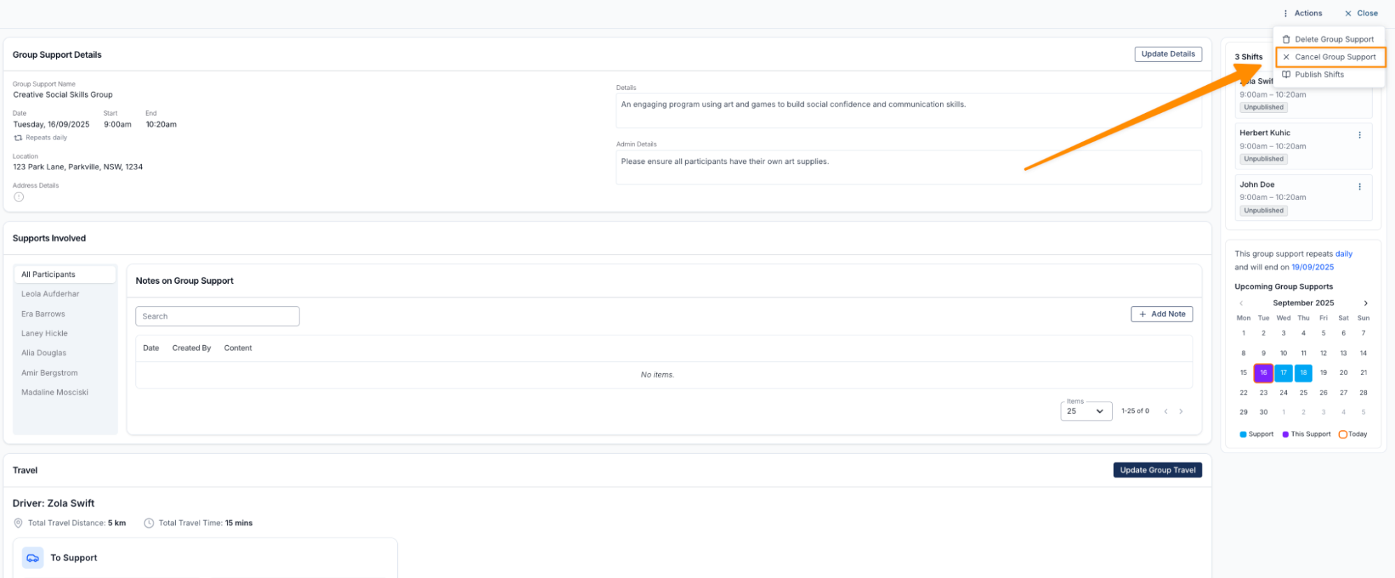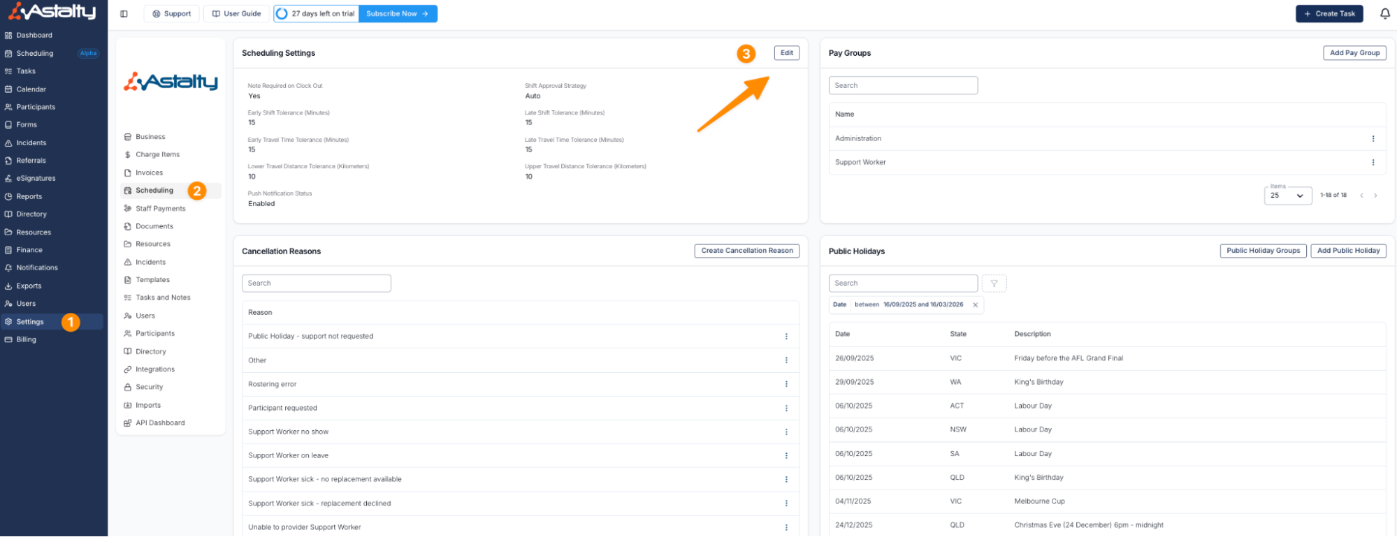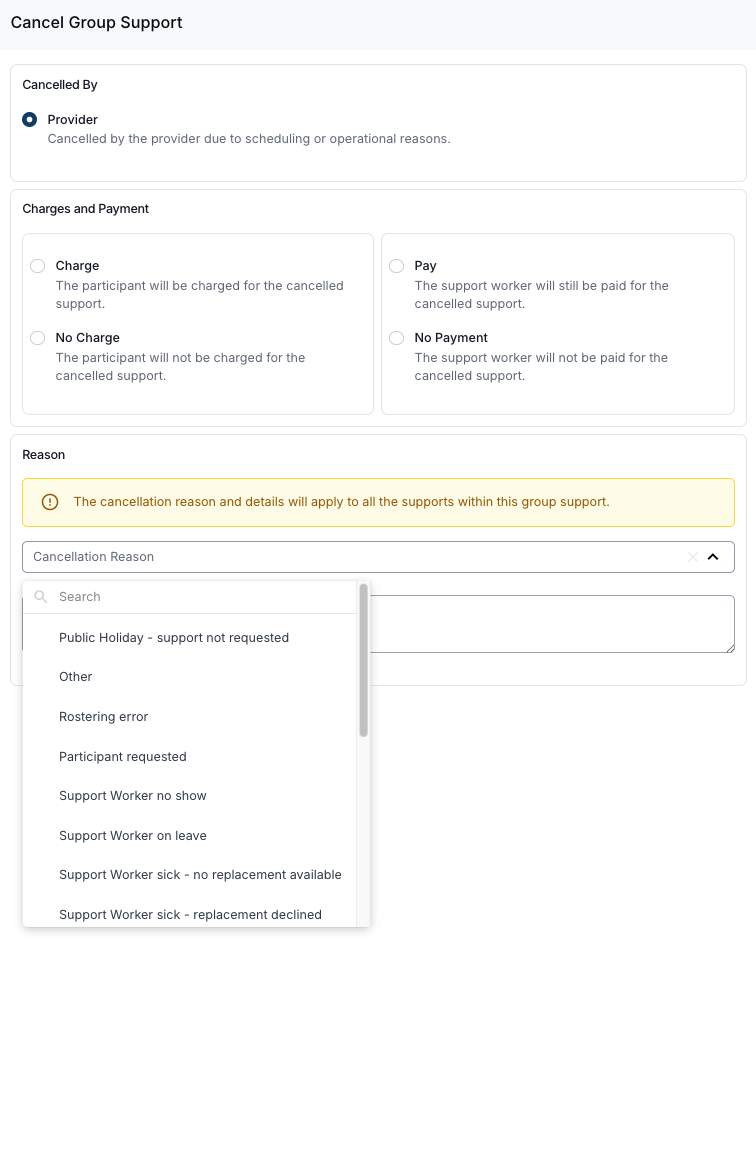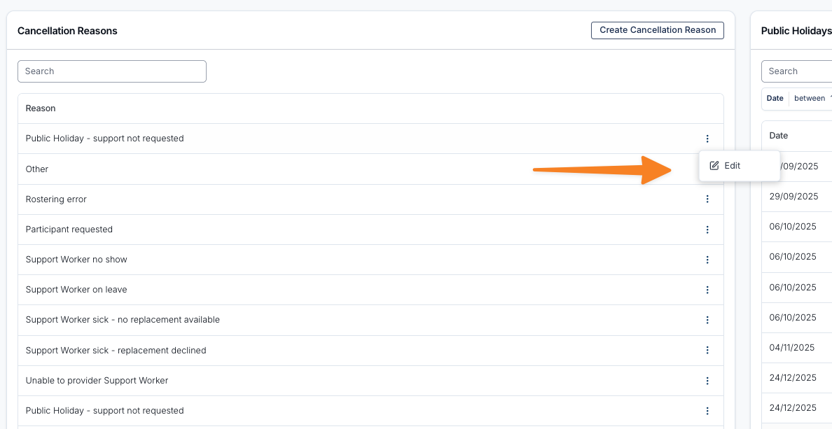 In Astalty, you can create and manage your own cancellation reasons. These reasons will appear whenever a support is cancelled, ensuring that cancellations are tracked consistently and accurately across your organisation.