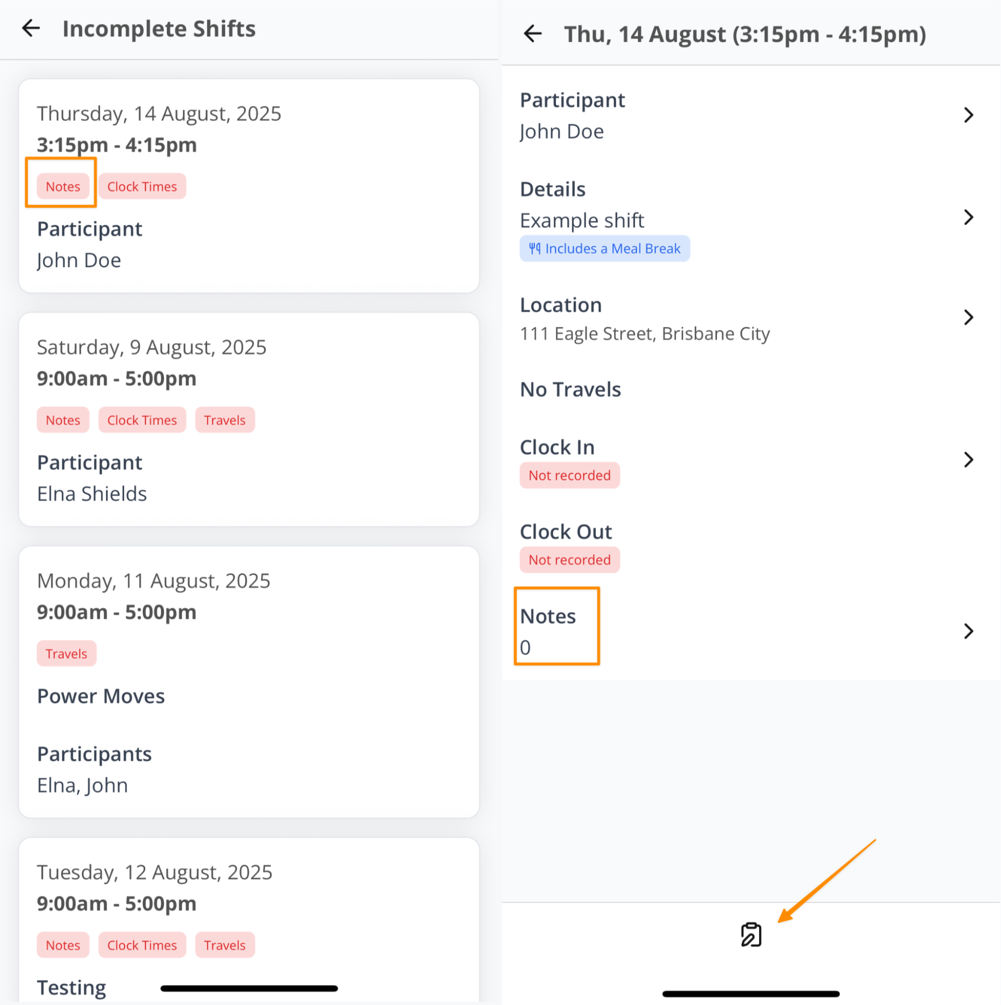 If a case note is not completed at the end of a shift, it will appear under Incomplete Shifts on the main screen of the Support Worker app. This helps you quickly identify any missing information that still needs to be recorded.