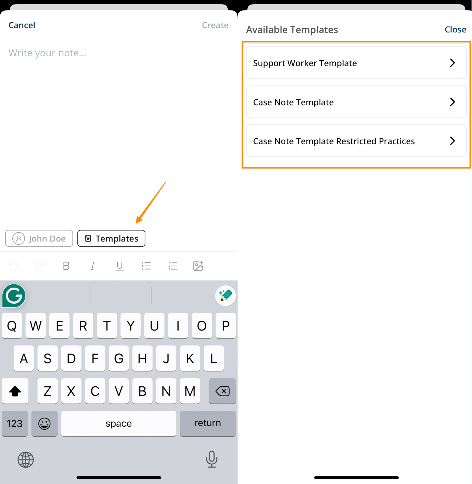 When writing case notes, you may have access to templates if your organisation has set them up. Templates provide a pre-structured format for notes, helping you remember what details to include and ensuring consistency across all case notes.
