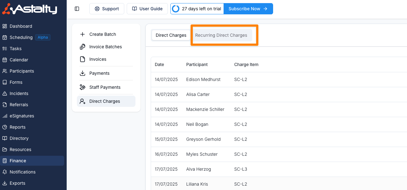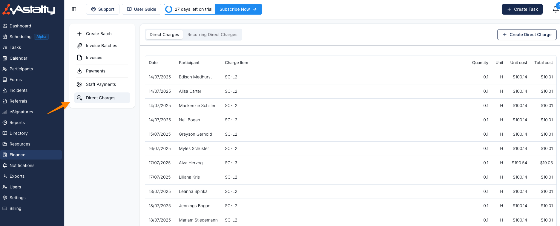 Direct Charges allow you to bill for items not linked to a specific task or scheduled support — such as respite, centre capital costs, non-face-to-face work, or SIL charges.