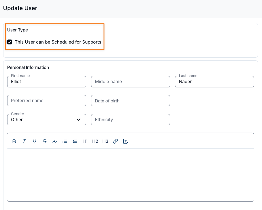 In Astalty, you can control which users are eligible to be scheduled on supports. This can be set either when inviting a new user or by updating an existing user’s profile.