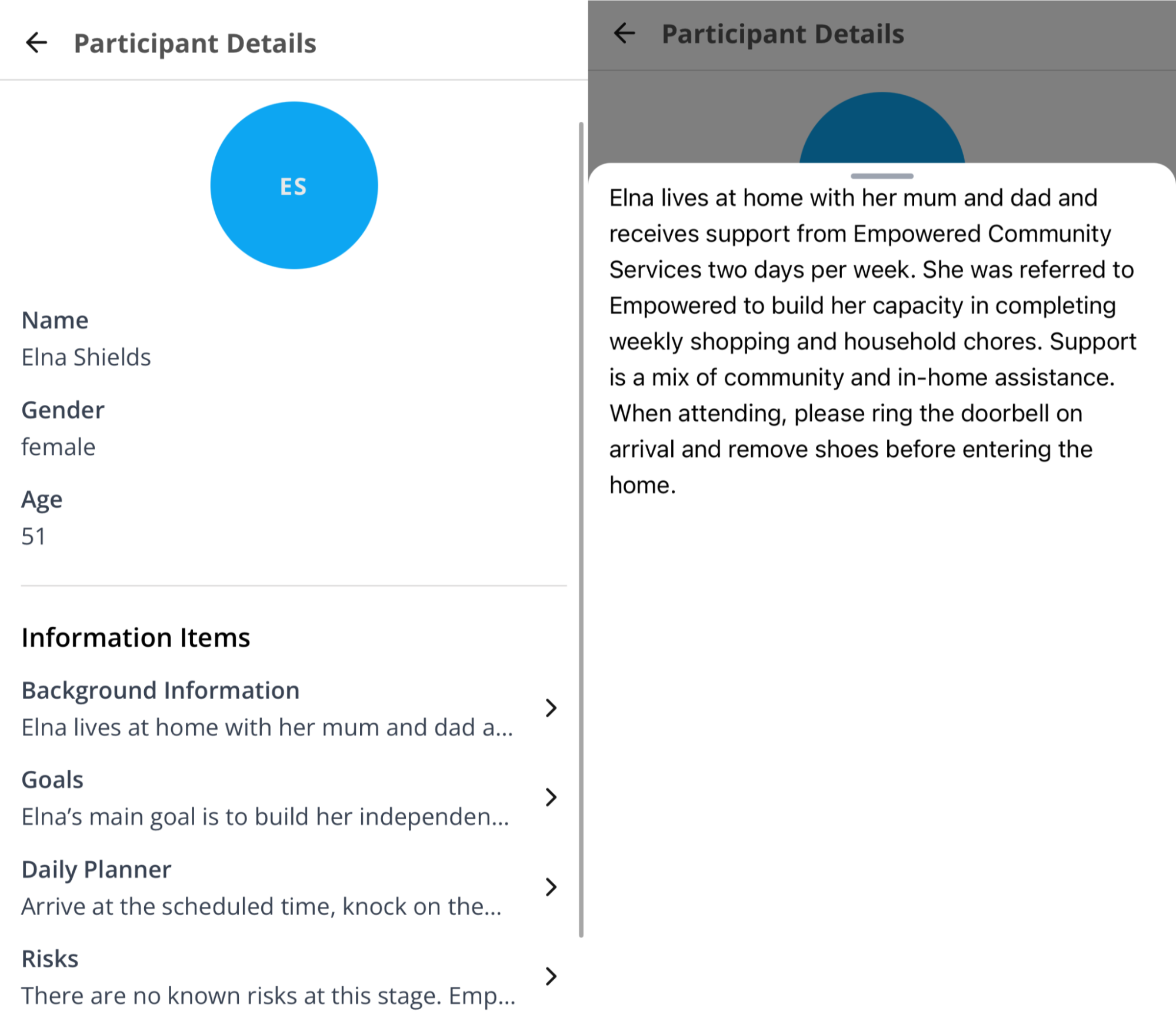 Once updated, the selected Information Item will be visible to Support Workers in the Astalty app under the participant’s profile.