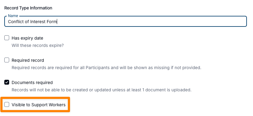 Astalty allows you to control which participant records are visible to Support Workers in the app. By marking a record type as Visible to Support Workers, you can share relevant information directly on a participant’s profile while keeping other records restricted to office staff. This helps ensure Support Workers have access to the details they need while maintaining confidentiality for sensitive information.