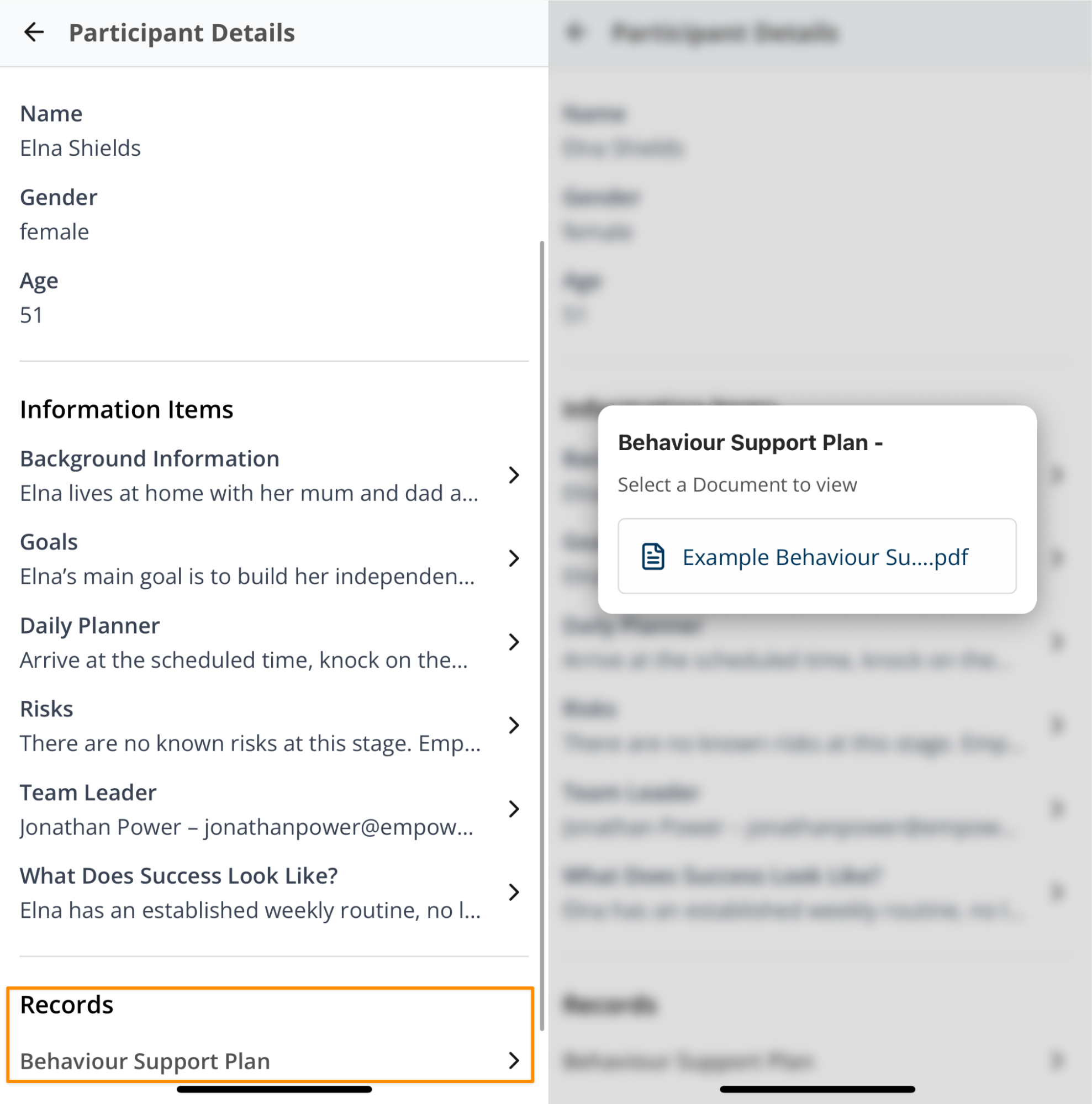 The screenshot below shows how participant records appear in the Astalty app from a Support Worker’s perspective. Only records marked as Visible to Support Workers will be displayed in this section of the participant’s profile.