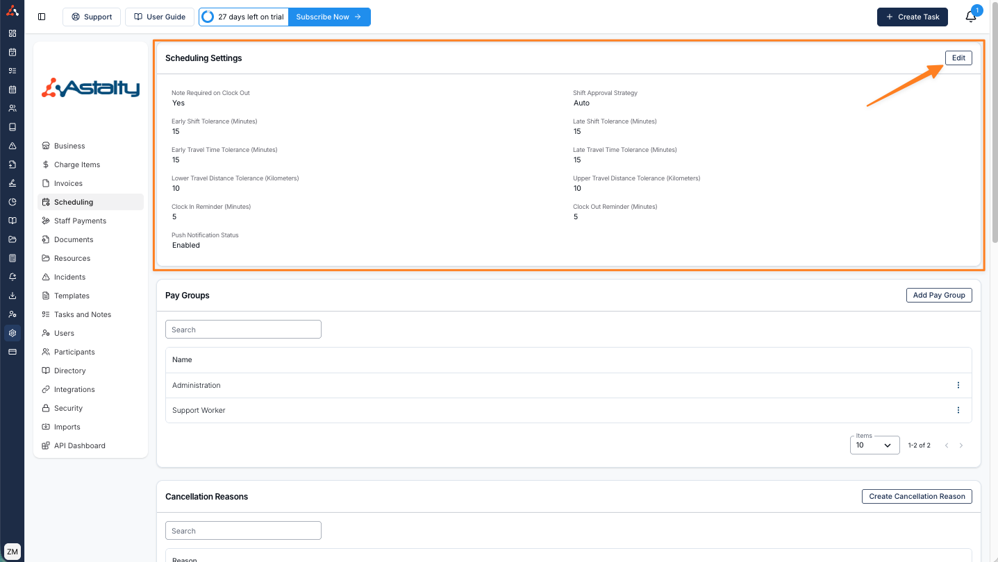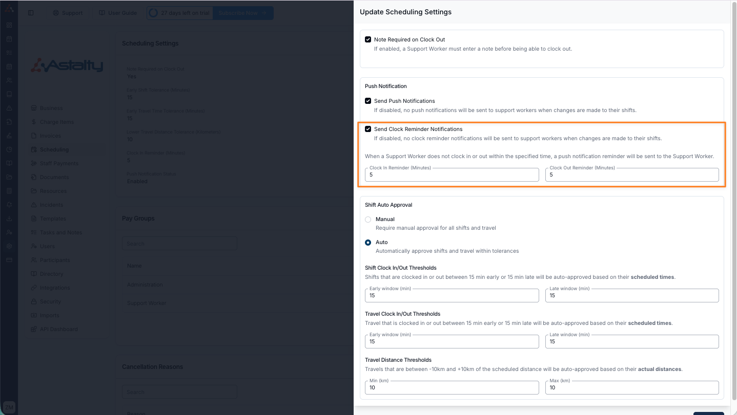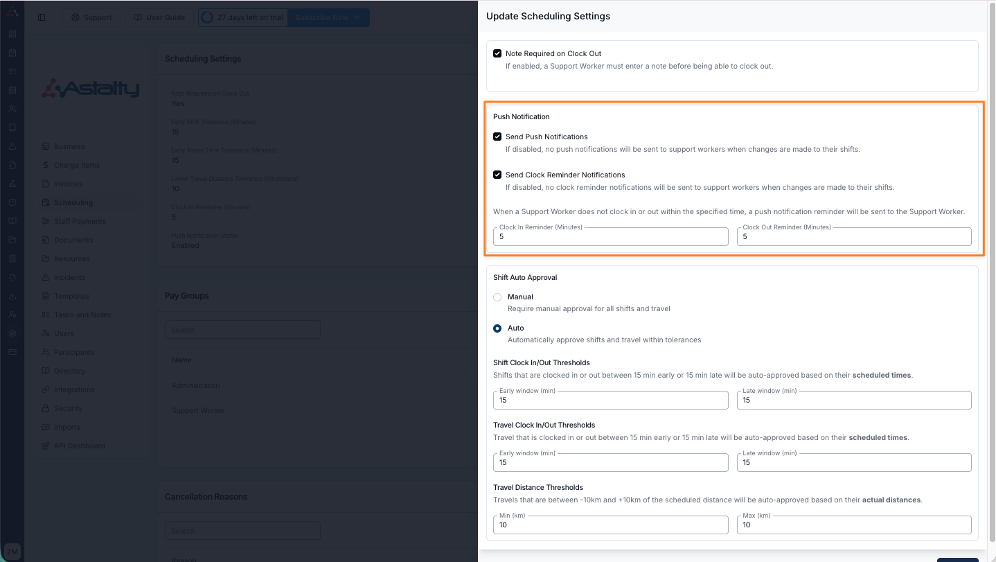 Within the push notification settings section of Astalty's Scheduling settings page you are now able to toggle whether you can send push notifications for users who have not clocked in, or out of their supports.