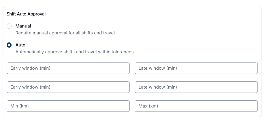 If Auto is selected, shifts and travel will be approved automatically if they fall within the tolerances you set. Anything outside of those tolerances will still require manual approval.