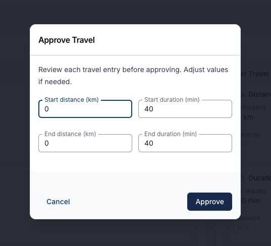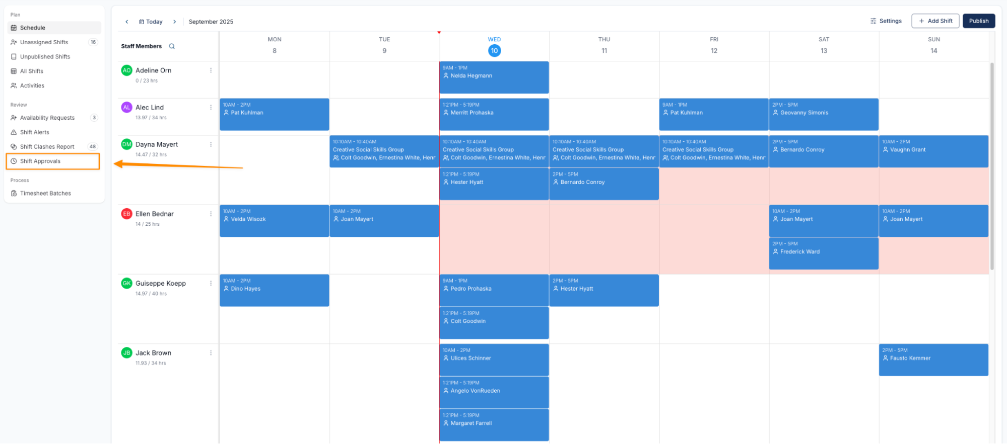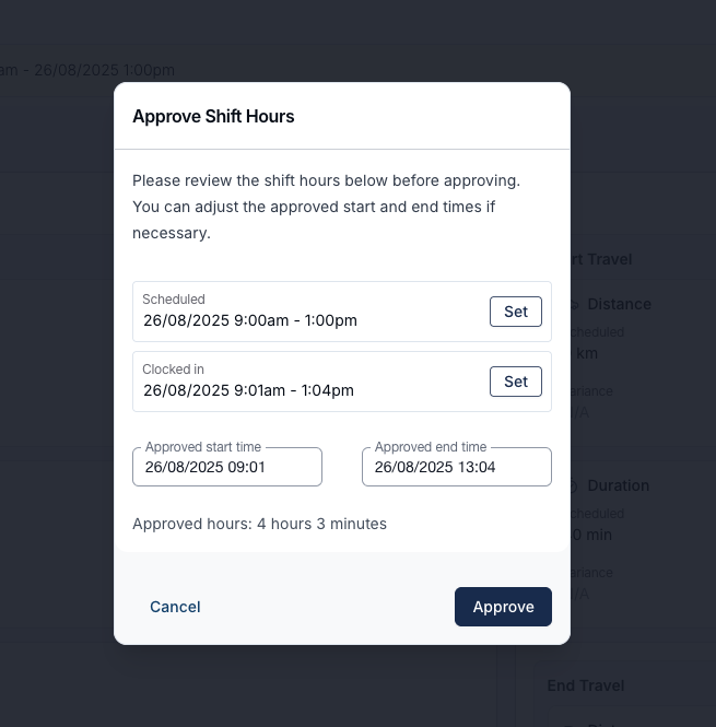 The Shift Approvals page is where you review and approve shifts before payroll is processed. This includes approving scheduled times, clock-in and clock-out times, and any associated travel claims (including travel, to, from and during support).
