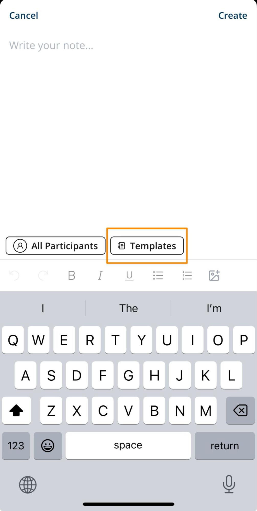 Scroll to the bottom of the note entry screen and select Templates. Choose the relevant template, it will load directly into your note entry. Fill in any additional details, then tap Create to save your case note.