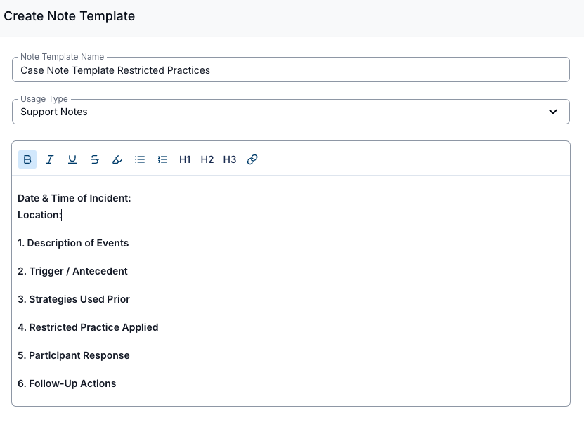 Similar to other note templates, you can create a Support Worker case note template to standardise how notes are recorded.