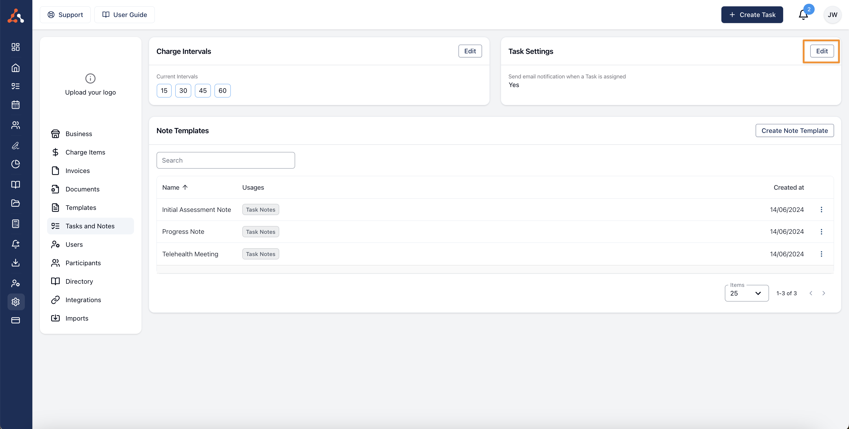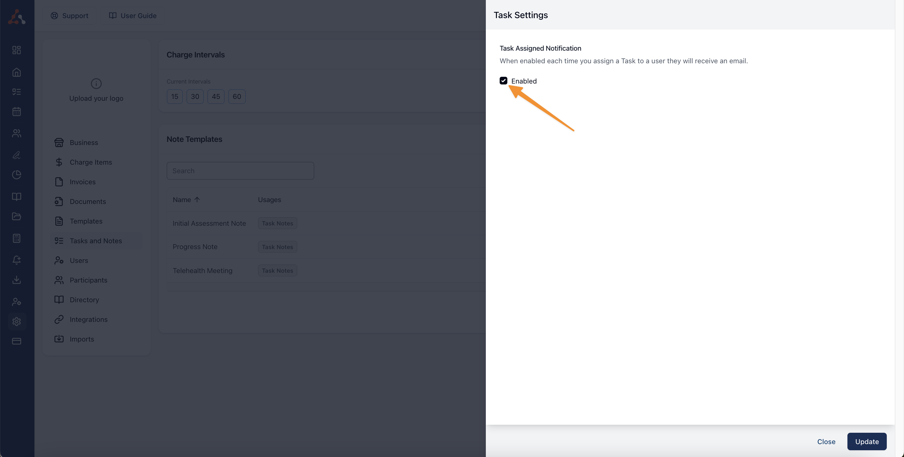 To toggle this setting navigate to the Tasks & Notes menu. As seen below you can edit the Task Settings.