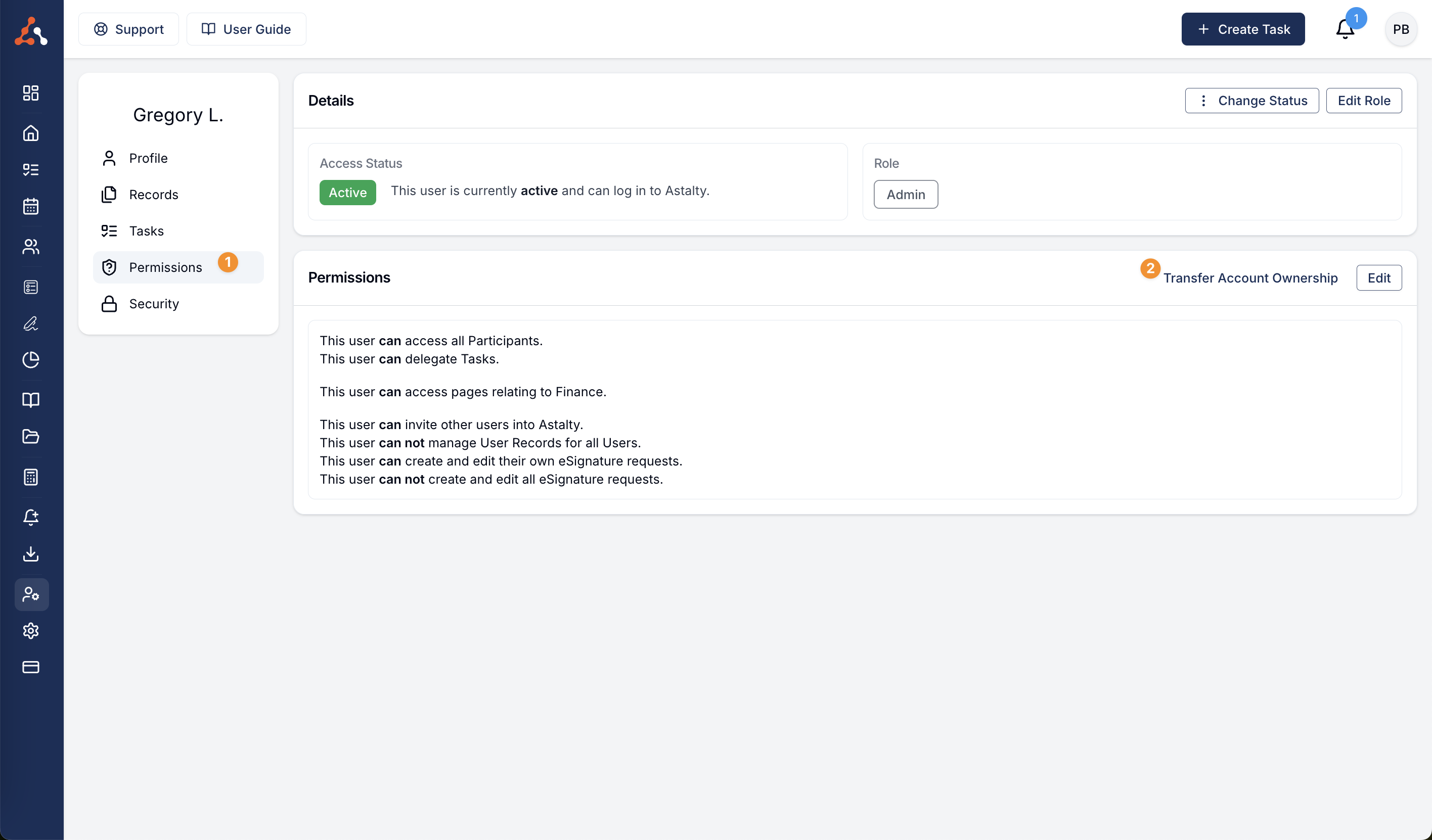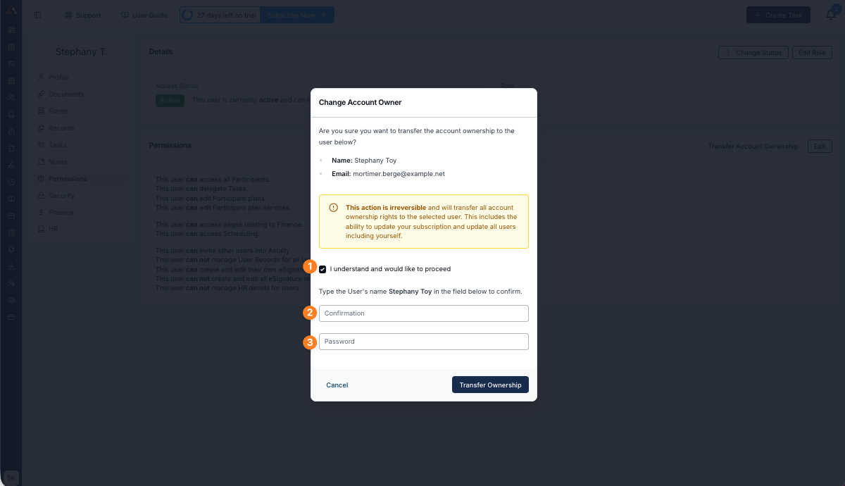 You can now update the Account Owner within Astalty. To do this navigate to the Users menu and select the user who you would like to become the new account owner. Once in their profile select the Permissions tab and you will see the 'Transfer Account Ownership' button within this screen as seen below. Note: the new account owner must have the Admin user role.