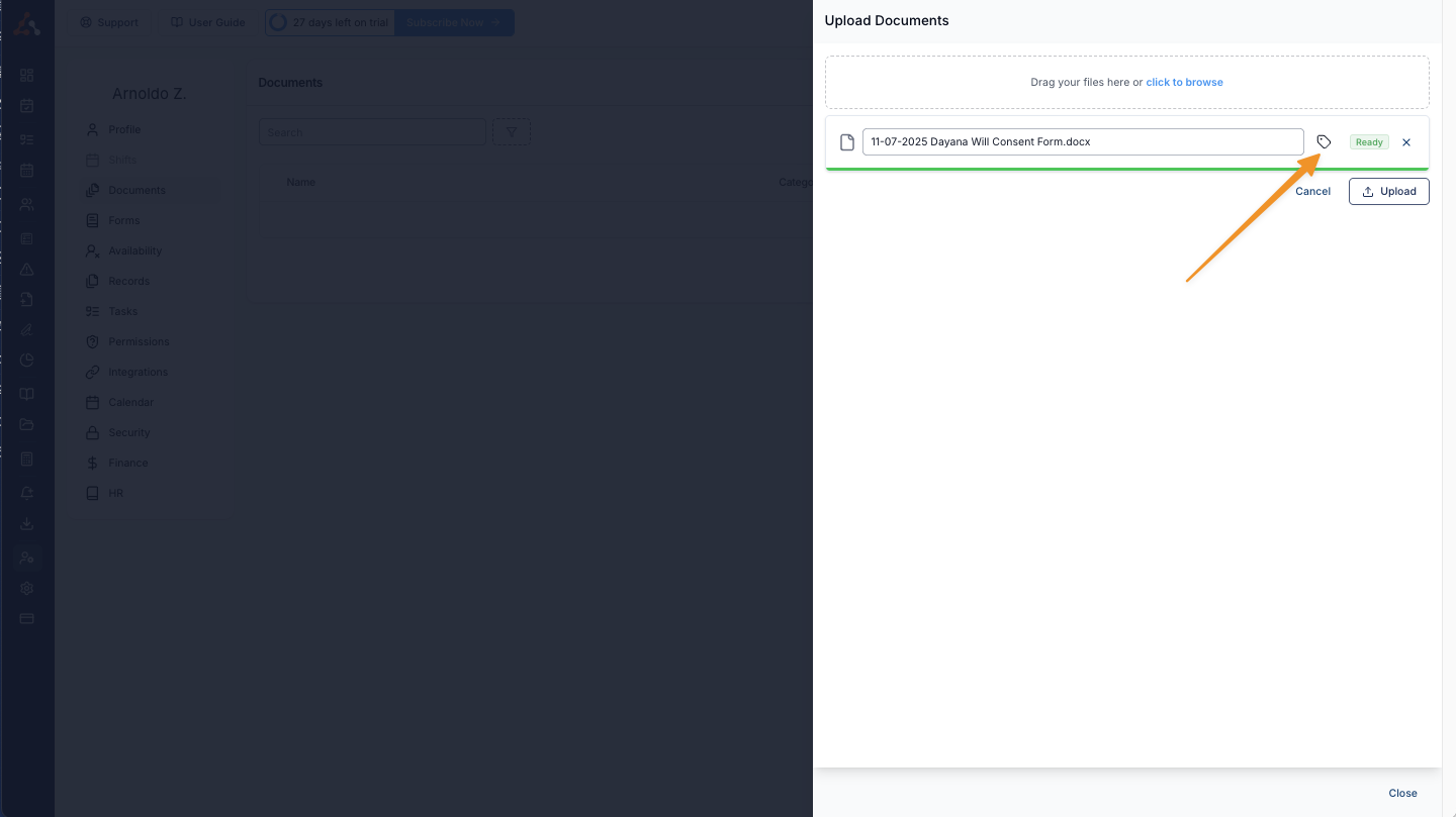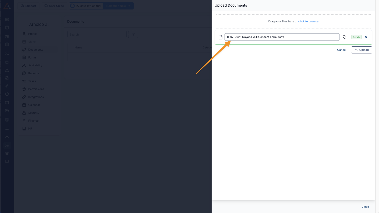To upload a document directly to a User's profile click on the Upload Documents button. This will open to Upload Documents form where you can click to browse files on your computer or drag and drop directly into the outlined area.